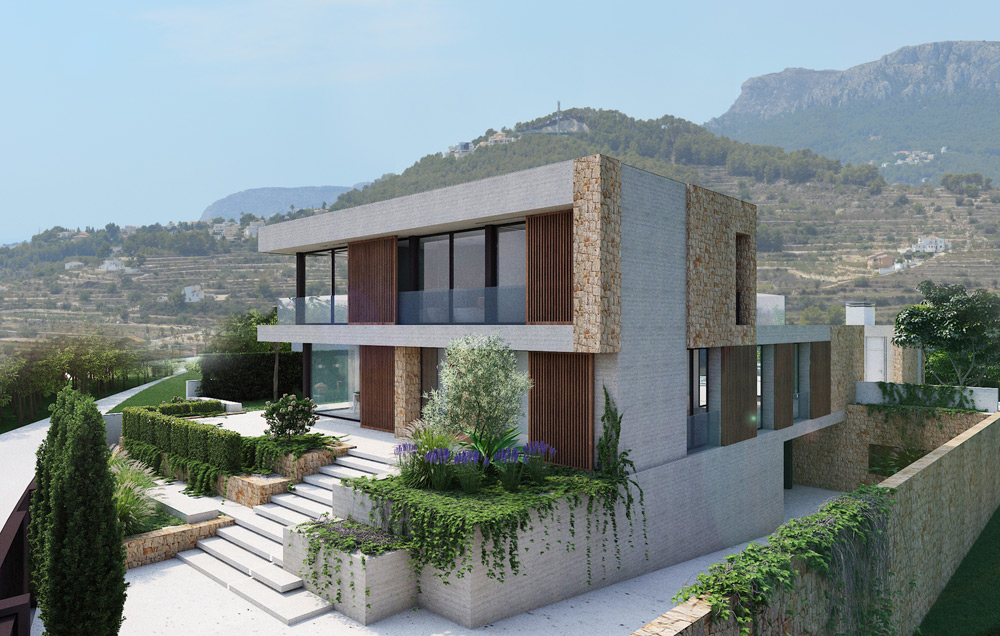 With over 670 m2 living area on a 1300 m2 plot, with splendid sea and mountain views, this is one of our most recent and ambitious projects. The villa is designed with 4 bedrooms, outdoor and indoor swimming pool, gymnasium, and domotics. This cast concrete structure with its natural wood patterning, large glazed areas, Stone, hardwood brise soleil and high spec. finishes, combine to produce an outstanding Contemporary Villa.